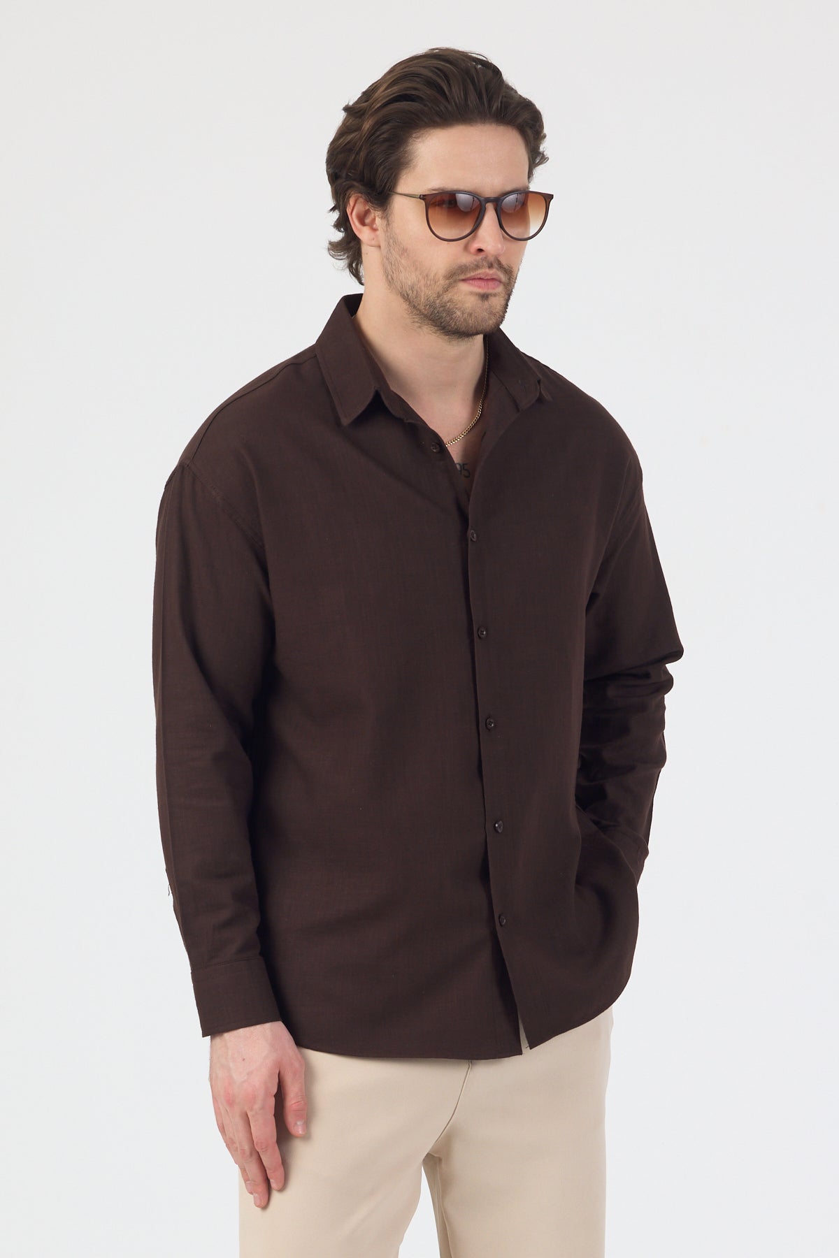 Erkek %100 Pamuklu Keten Görünümlü Pantolon Gömlek Takım Kahverengi